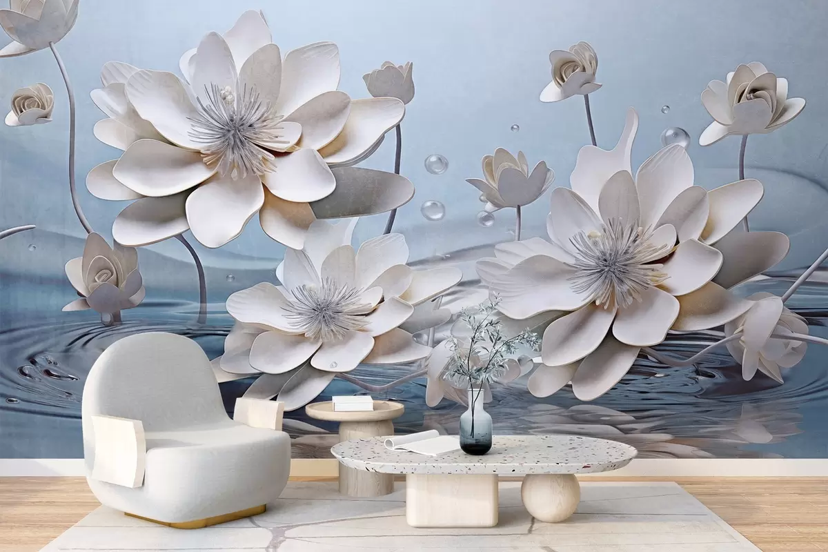 Fototapety Biele textúrované kvety s kvapkami vody, odrazy na vodnej hladine, svetlomodré pozadie, elegantný dizajn Nr. w09262