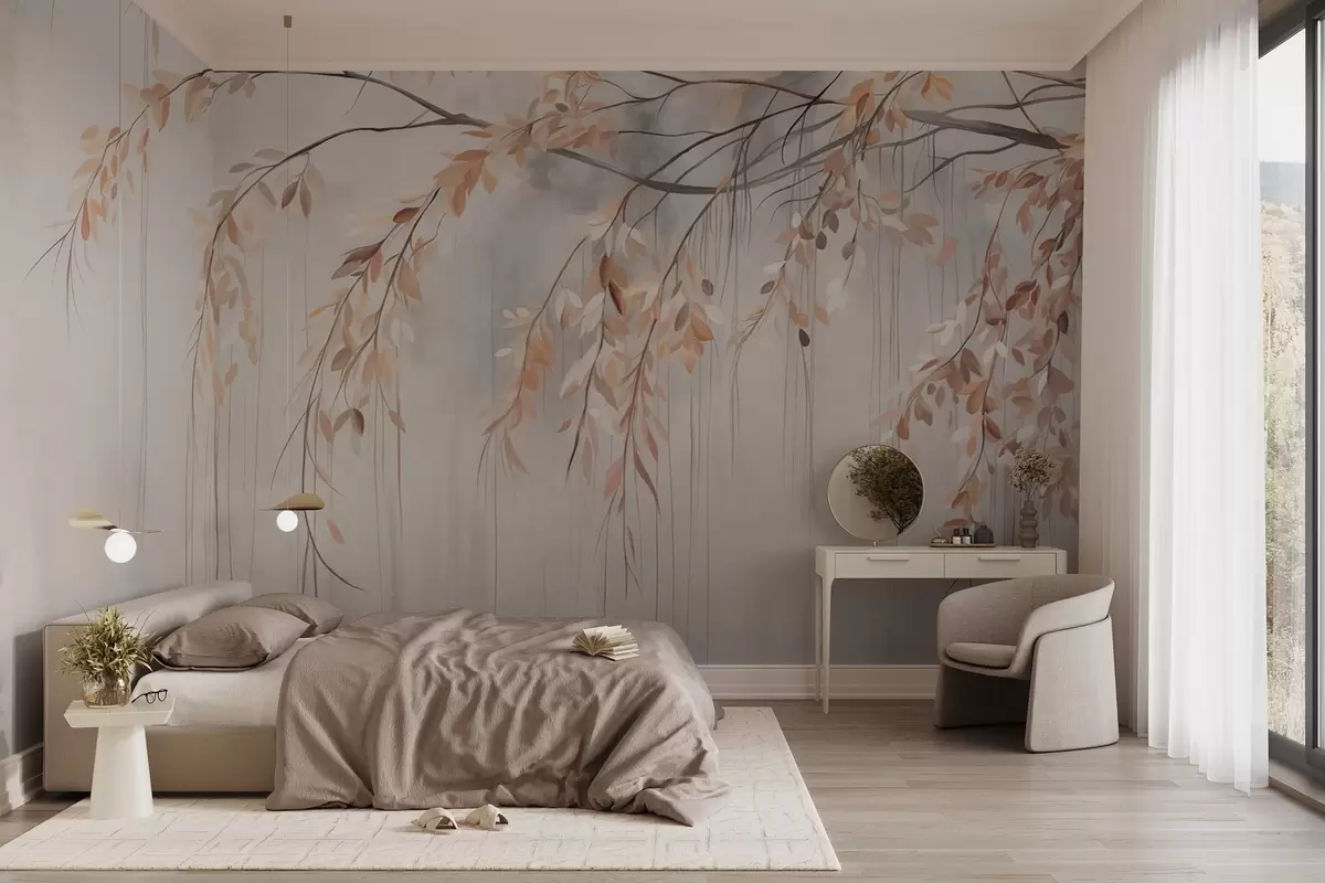 Fototapety Vetva so svetlooranžovými listami visiacimi dole, svetlosivé textúrované rozmazané pozadie, mäkký a jemný štýl Nr. w09265