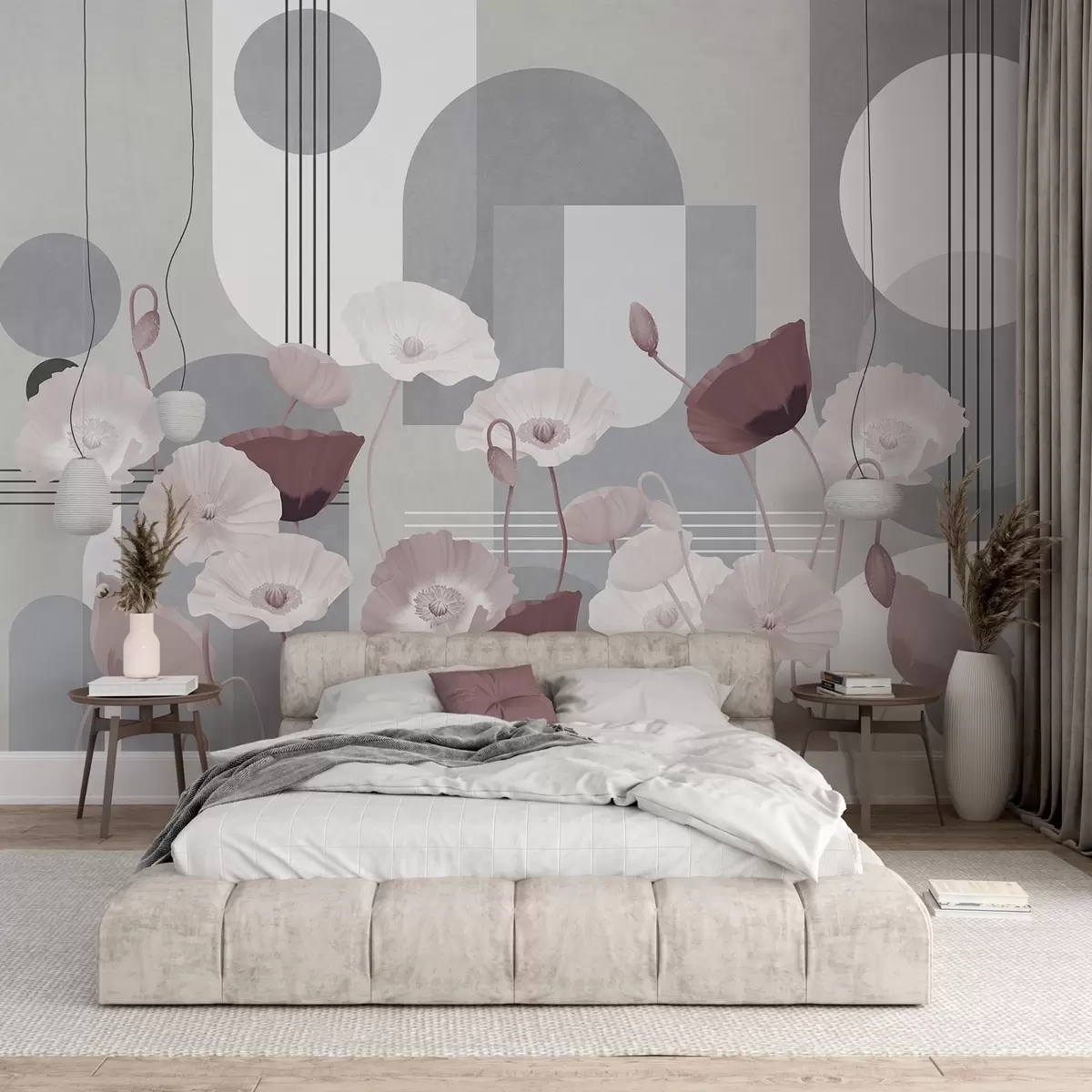 Fototapety Maky v bielych a sivých farbách s geometrickými tvarmi v pozadí, kruhy a oblúky, minimalistický štýl, jemné farby Nr. w09289v1