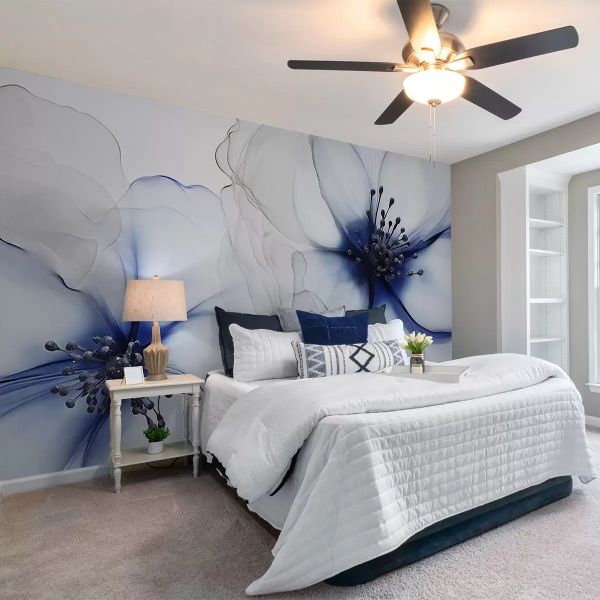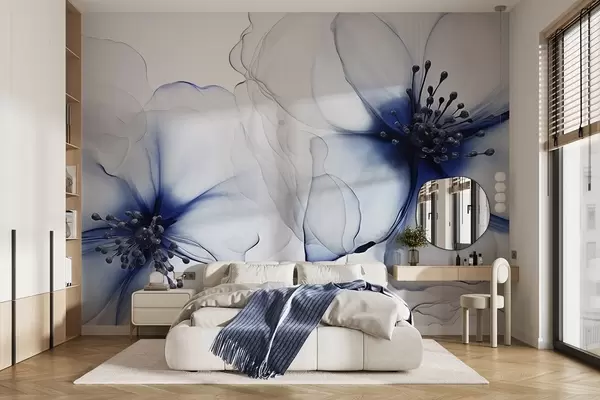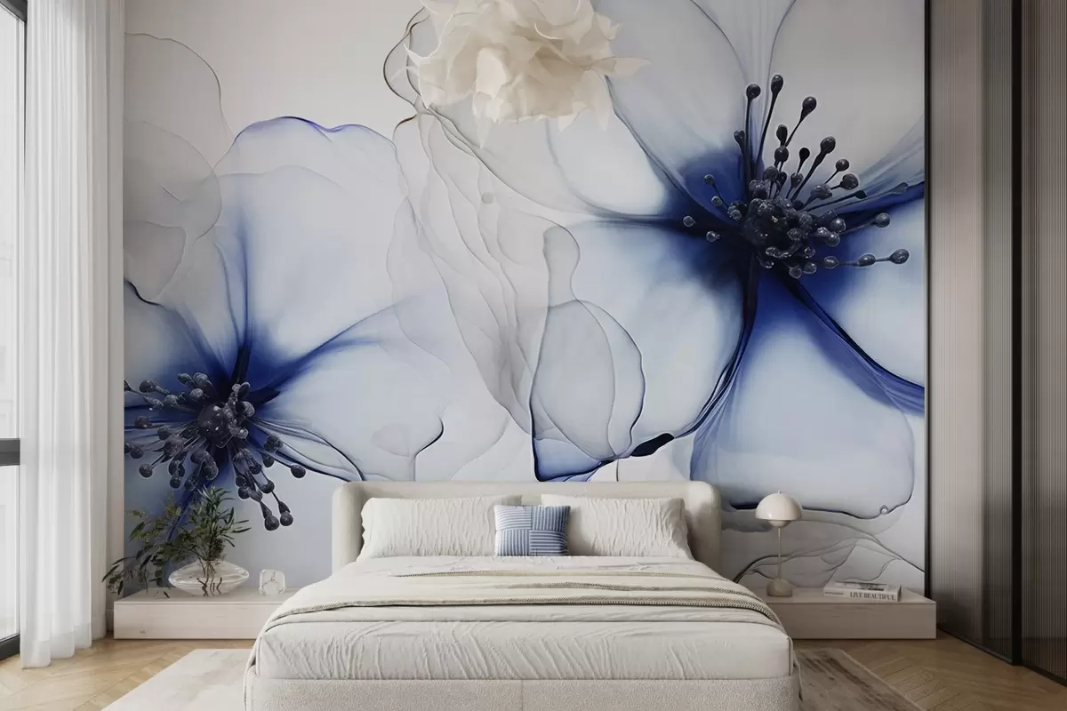 Fototapety Dva priesvitné modré kvety s viditeľnými tyčinkami, prekrývajúcimi sa jemnými okvetnými lístkami a jemnou splývavou štruktúrou Nr. w09295v1