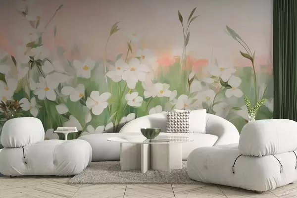 Fototapety Abstraktné pole divokých kvetov so zelenými stonkami a listami na pozadí jemne ružovej a bielej textúrovanej oblohy Nr. w09297