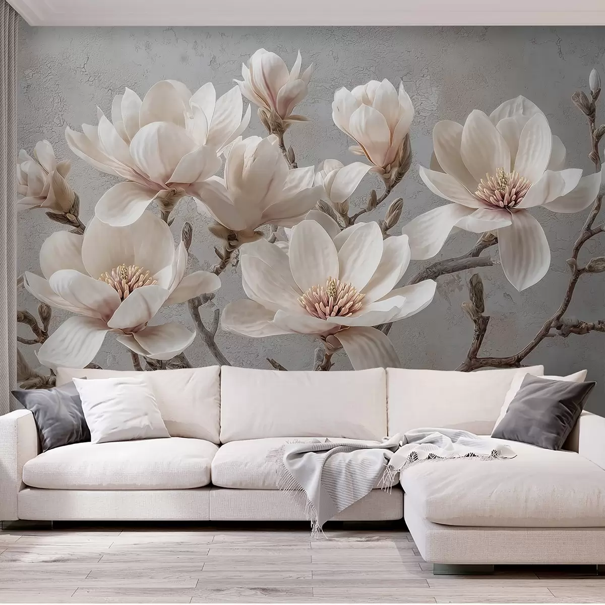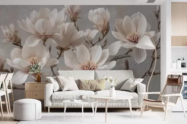 Fototapety Konáre magnólie s veľkými svetlými kvetmi v tlmených tónoch Nr. w09305