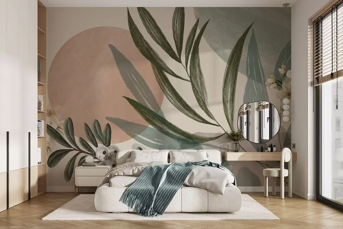 Fototapety Abstraktné botanické umenie so zelenými palmovými listami a bielymi bobuľami na pozadí tvarov v tlmených zemitých tónoch Nr. w09312
