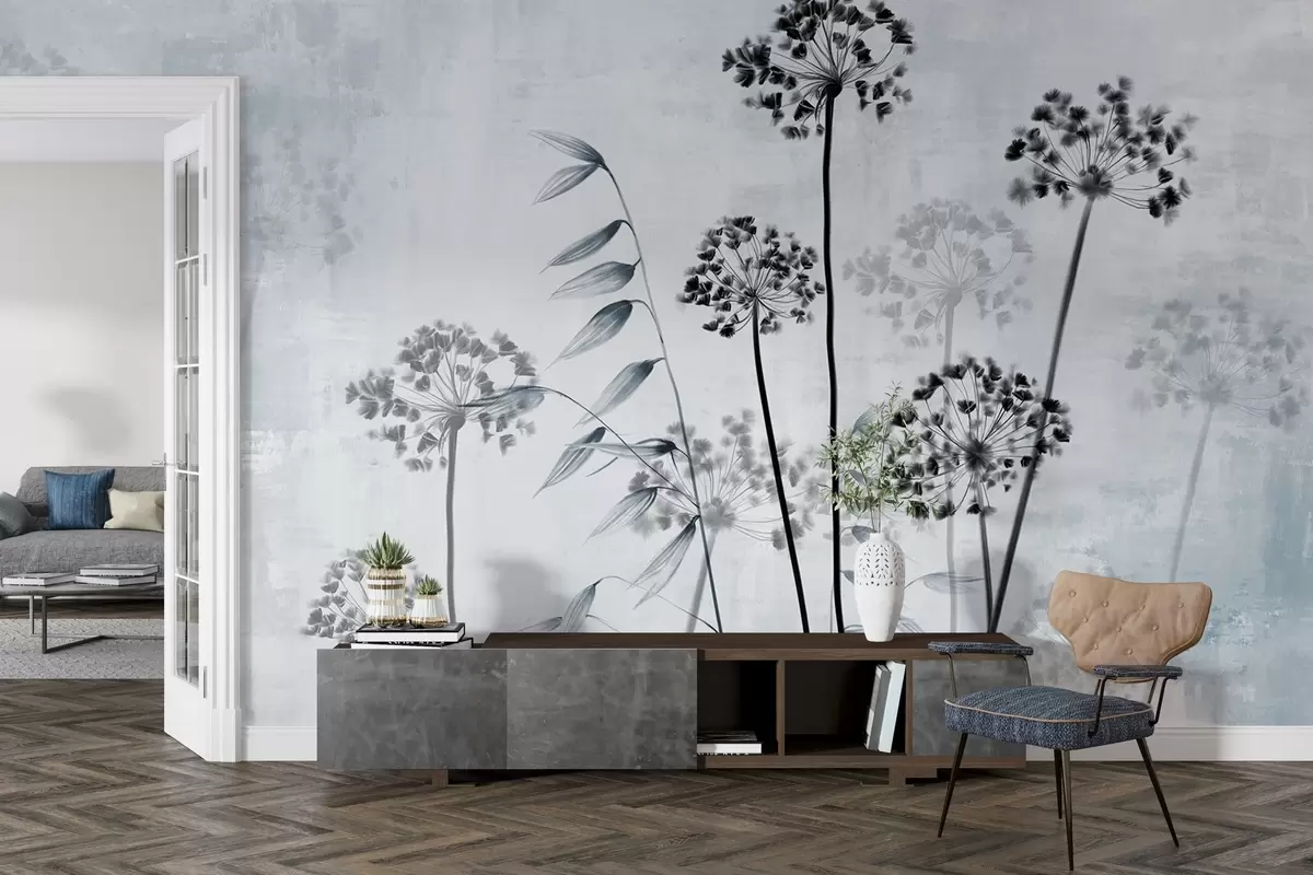 Fototapety Kresba sušených kvetov s dlhými stonkami, jednofarebná paleta, na textúrovanom, svetlosivom pozadí, botanická ilustrácia Nr. w09314