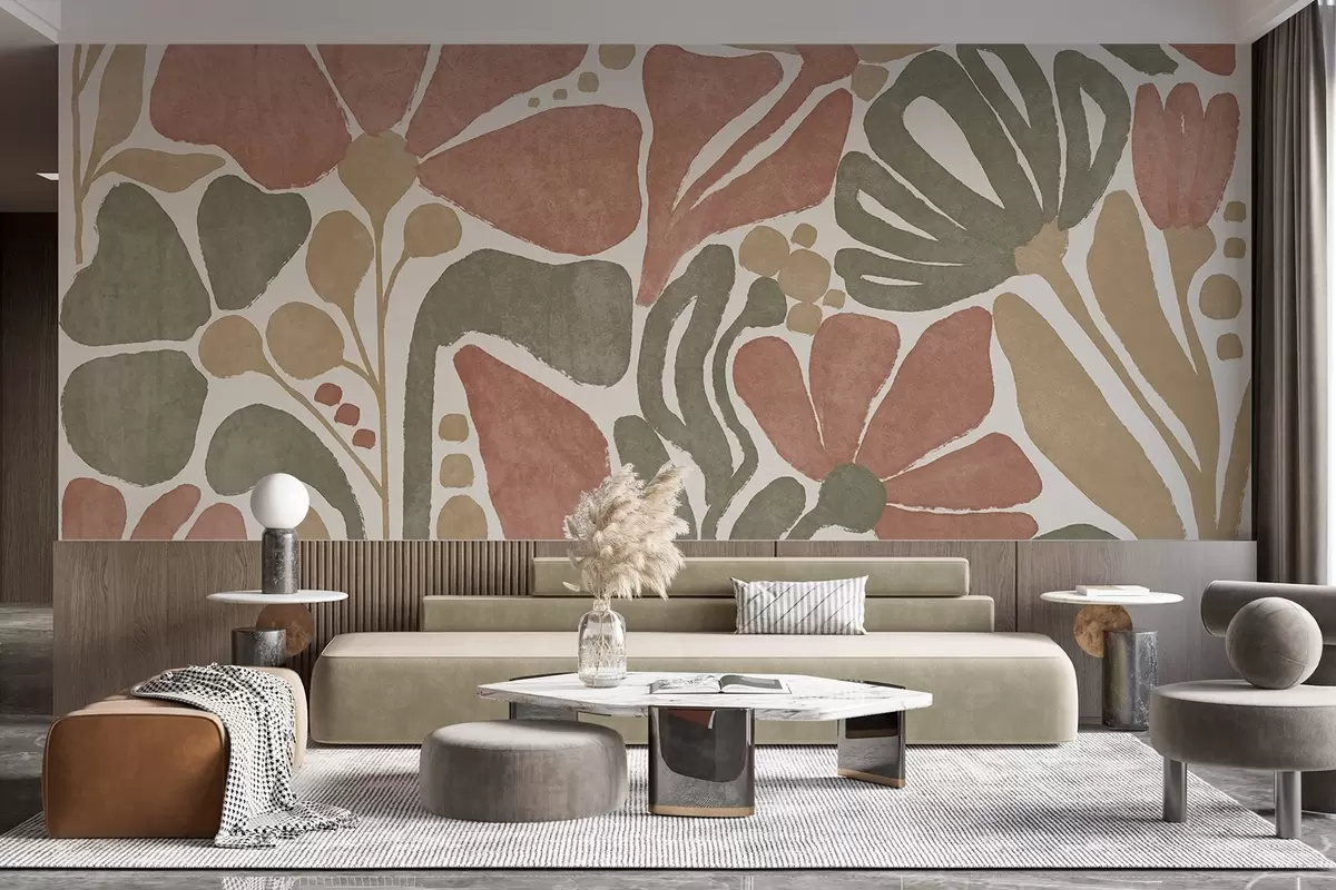 Fototapety Abstraktné kvety v odtieňoch červenej, zelenej a béžovej so svetlým pozadím v plochom, štylizovanom modernom minimalistickom dizajne Nr. w09315