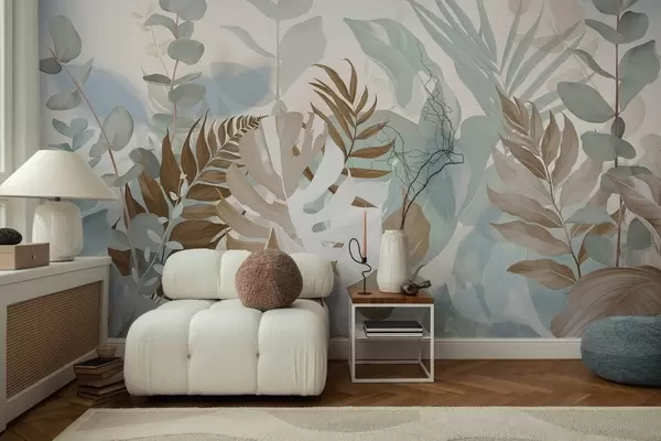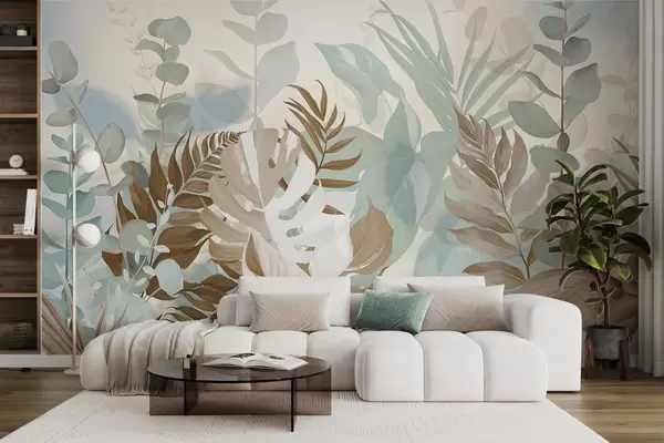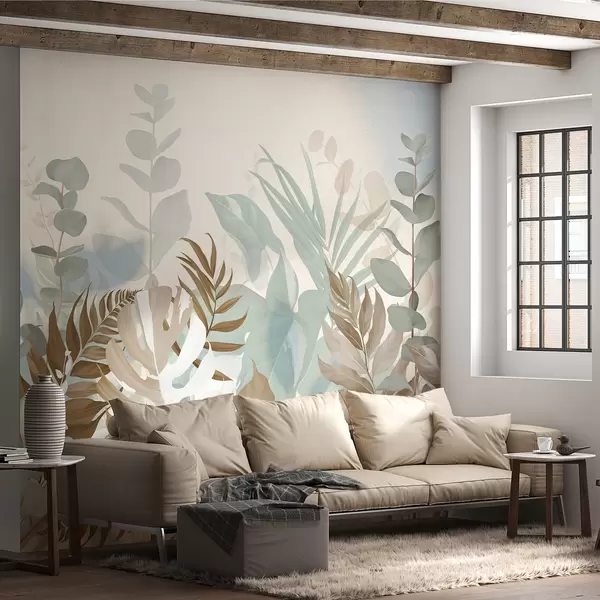 Fototapety Pastelové rastliny paprade, monstera a eukalyptus, ľahké textúrované pozadie, mäkké osvetlenie, pokojné , botanické ilustrácie Nr. w09316v1