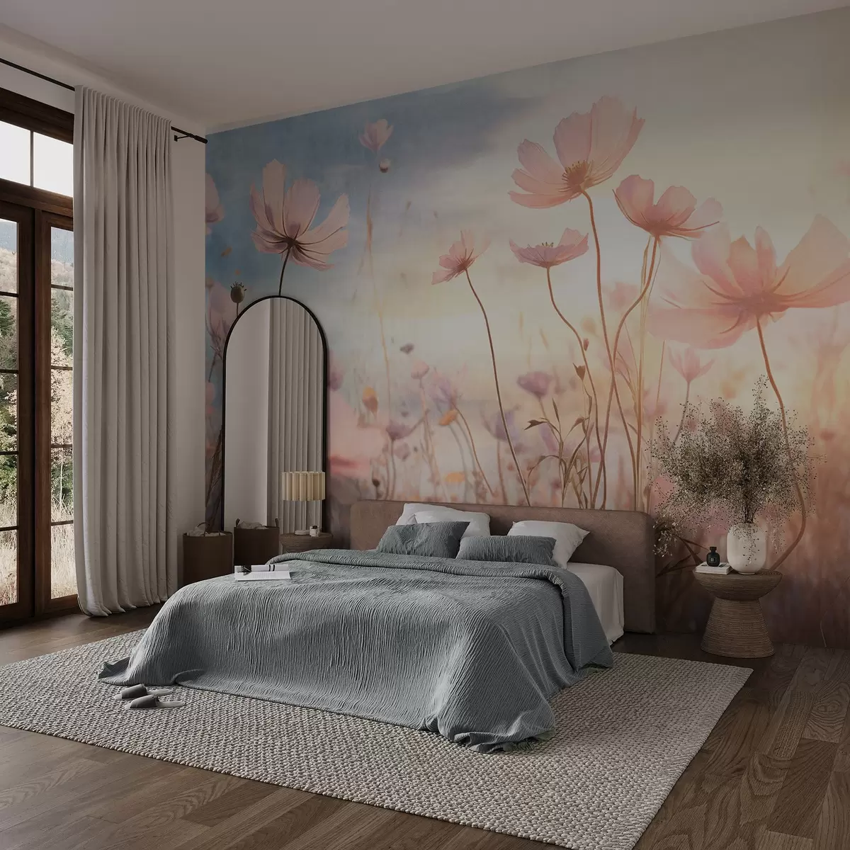 Fototapety Pole ružových štruktúrovaných kvetov s dlhými stonkami na pozadí jemnej modrej a žltej oblohy, ktoré vytvára snovú atmosféru Nr. w09320