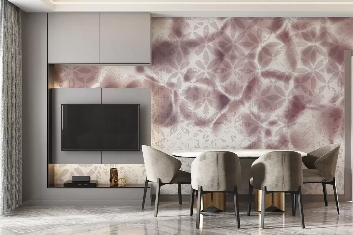 Fototapety Abstraktné textúrované umenie s bordovou kvetinovou potlačou, vyblednutým a rozmazaným efektom, ktoré vytvára jemnú a zasnenú atmosféru Nr. w09322v1