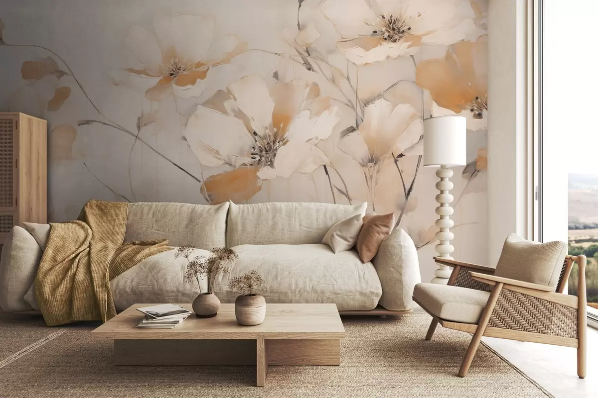 Fototapety Biele a oranžové textúrované kvety s dlhými stonkami, svetlé pozadie, jemné farby, elegantné zloženie, jemné ťahy štetcom Nr. w09335