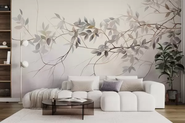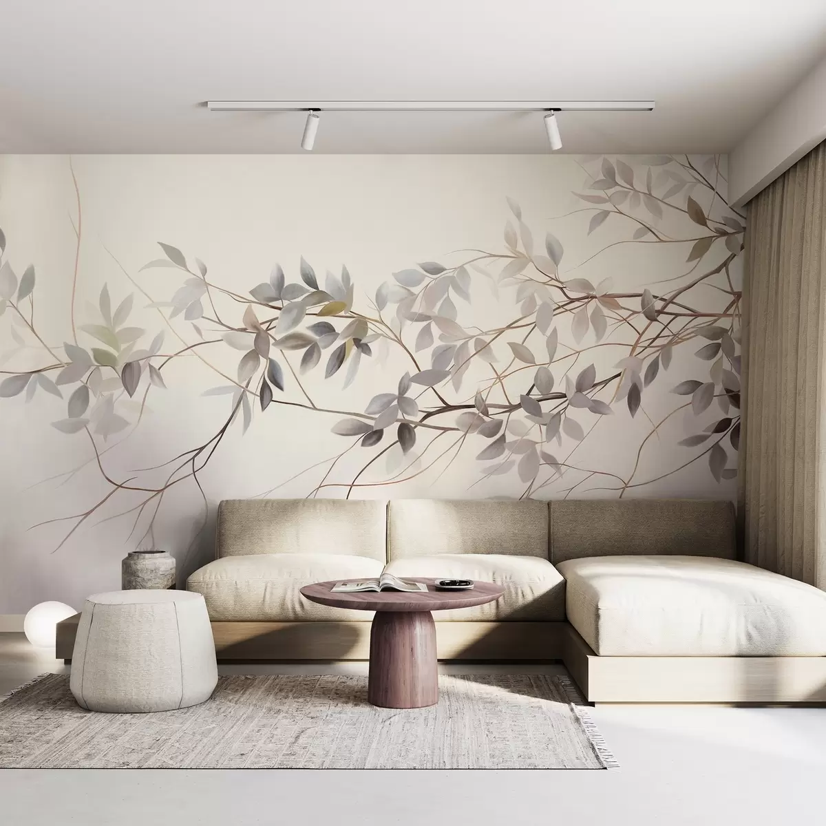Fototapety Jemné textúrované vetvy s tlmenými sivými, fialovými a zelenými listami na jemnom, rozmazanom pozadí Nr. w09336