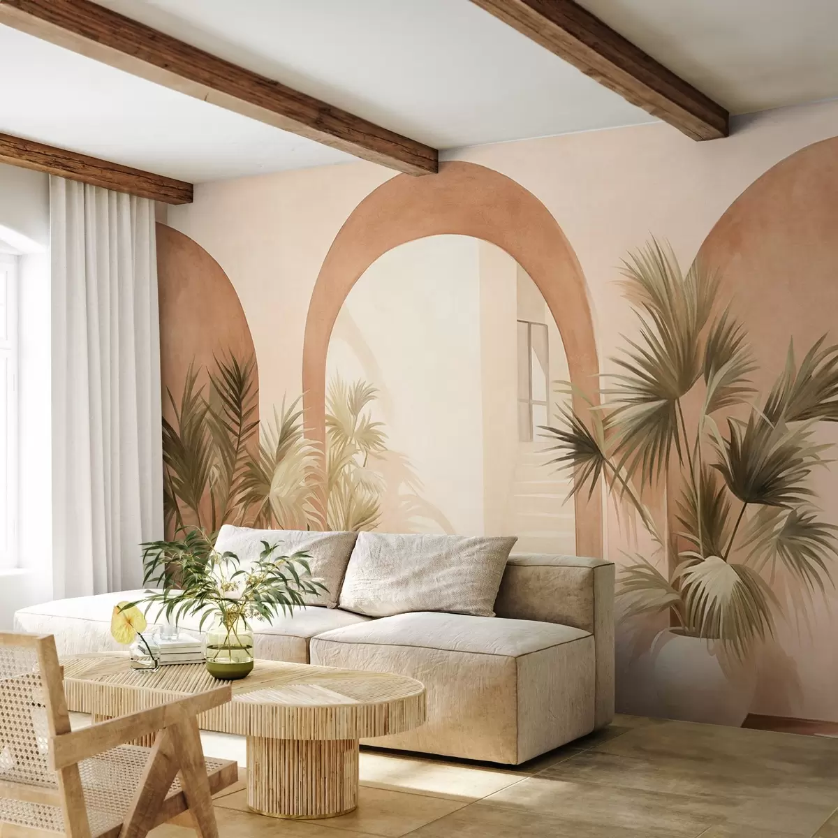 Fototapety Textúrované oblúky s rastlinami v kvetináčoch, svetlá béžová paleta farieb, minimalistický dizajn, schodisko v pozadí Nr. w09339