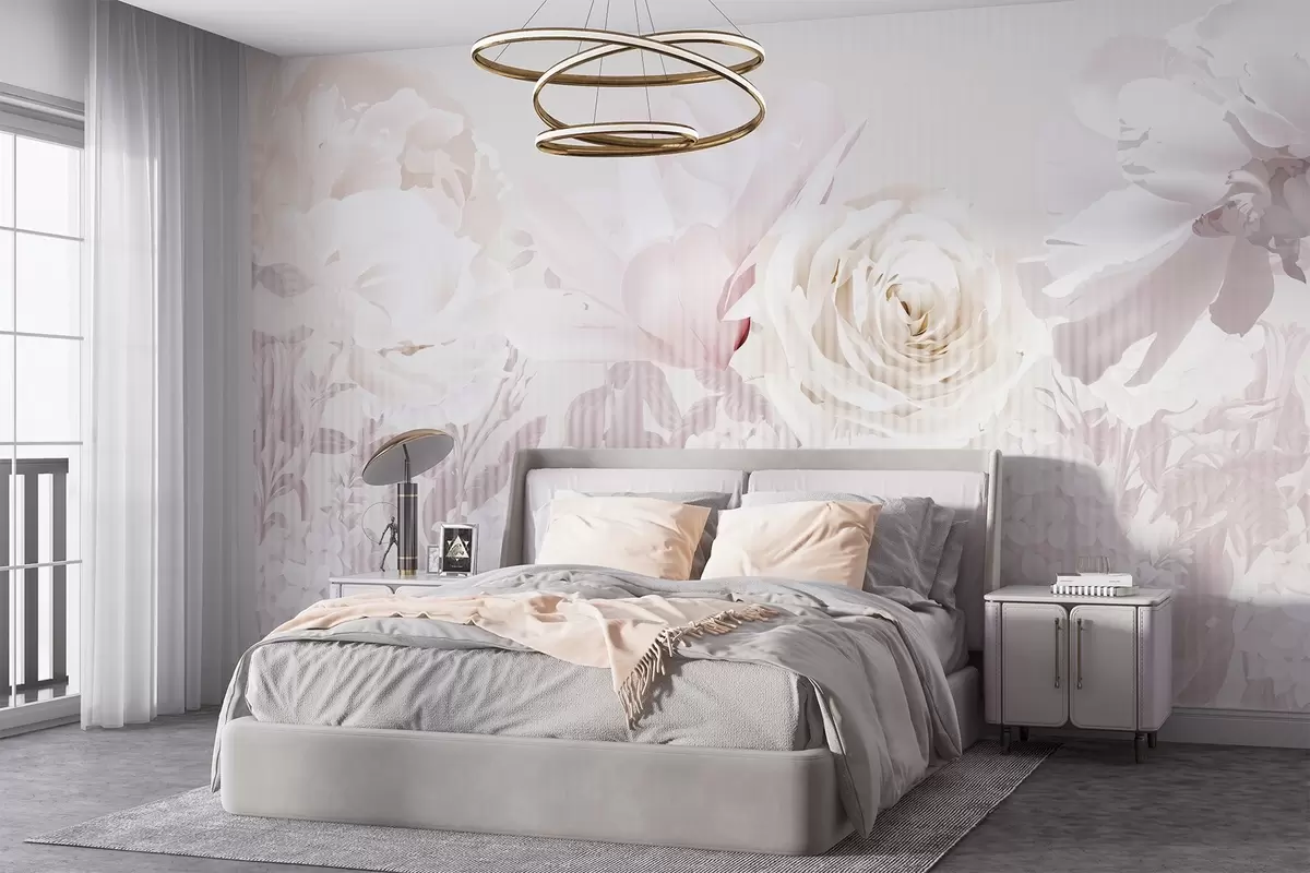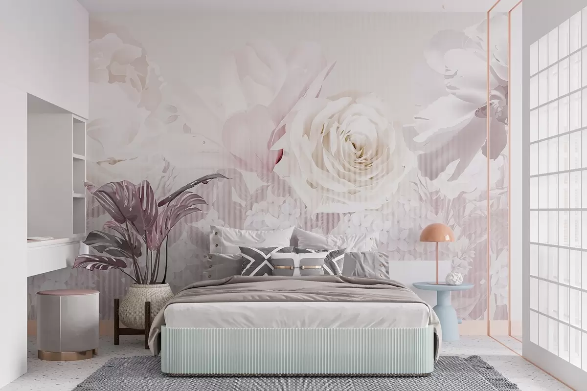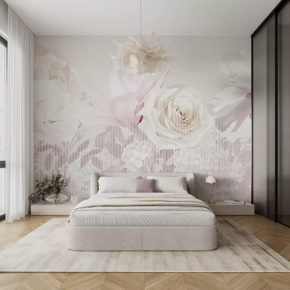 Fototapety Kvetinová výzdoba s ružami, hortenziami a tulipánmi v jemných pastelových odtieňoch bielej, ružovej a béžovej s pruhovanou textúrou Nr. w09340