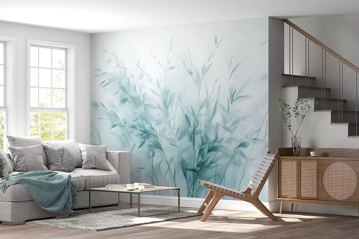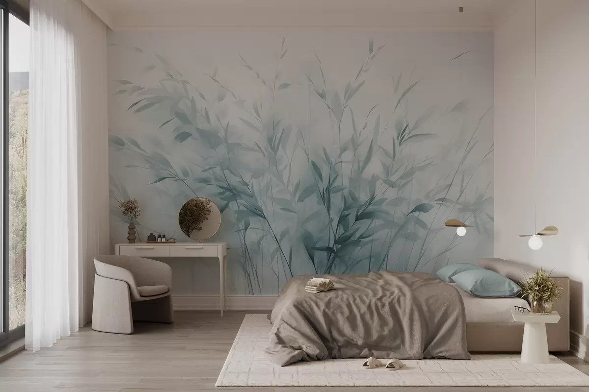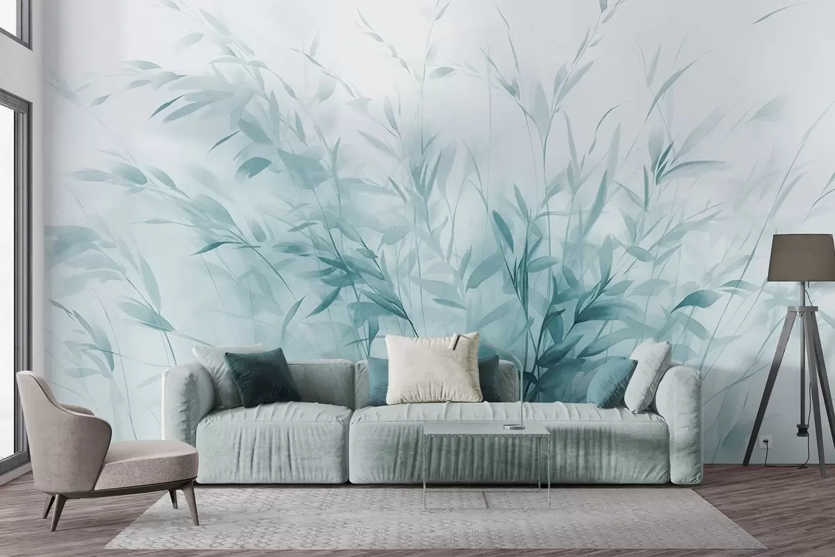 Fototapety Tráva a burina s tenkými listami a stonkami, svetlomodré farby, mäkké a jemné ťahy štetcom, minimalistická tlač Nr. w09342v1