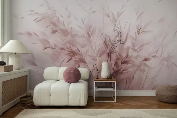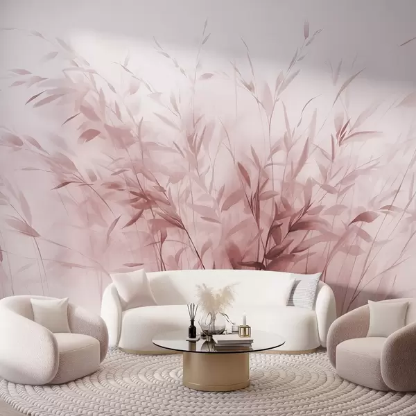 Fototapety Tráva a burina s tenkými listami a stonkami, svetloružové farby, mäkké a jemné ťahy štetcom, minimalistická tlač Nr. w09342v2