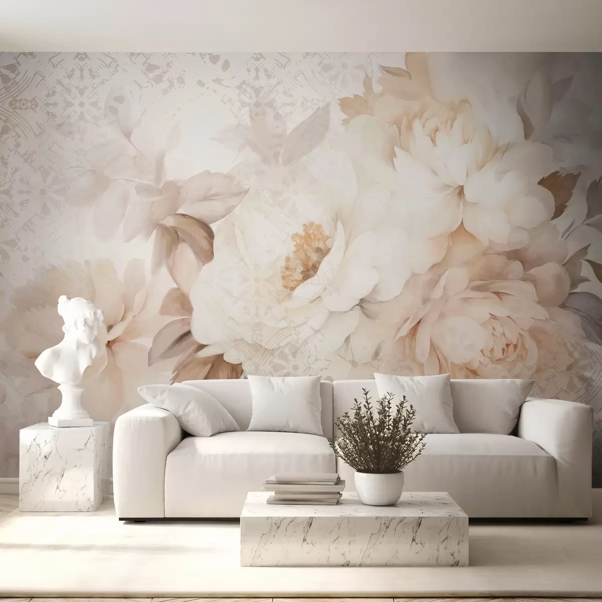 Fototapety Kvetinový aranžmán z bielych pivoniek s béžovými listami na dekoratívnom pozadí s vintage textúrou Nr. w09345