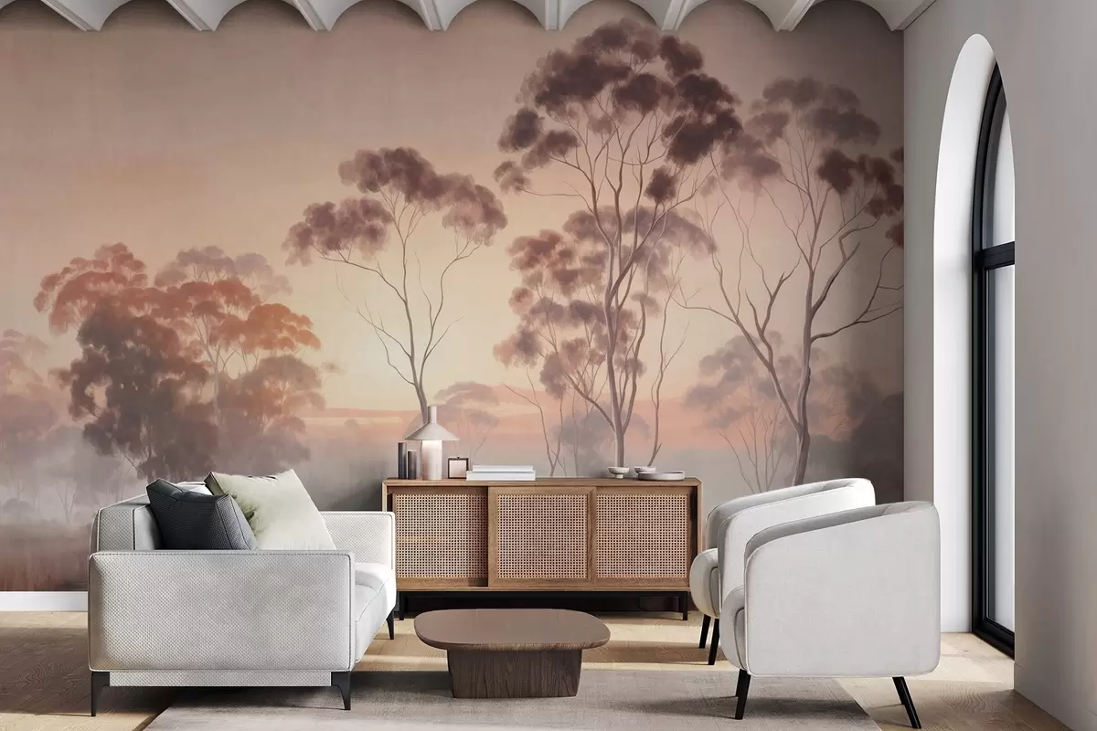 Fototapety Krajina s eukalyptovými stromami v poli s pastelovou ružovou a oranžovou oblohou, ľahká hmla, maľba v textúrovanom štýle Nr. w09367
