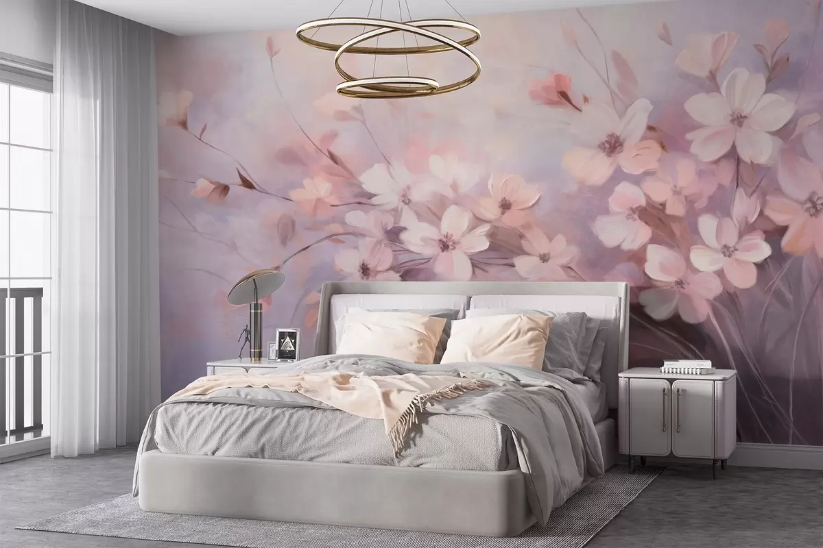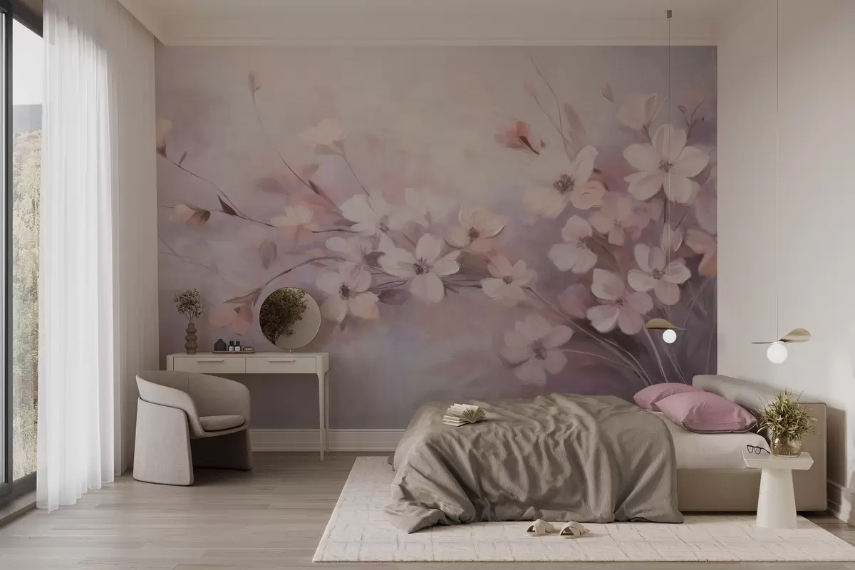 Fototapety Kvetinový aranžmán s jemnými kvetmi s mäkkými, rozmazanými okrajmi na pastelovom pozadí levanduľových a svetloružových odtieňov Nr. w09369