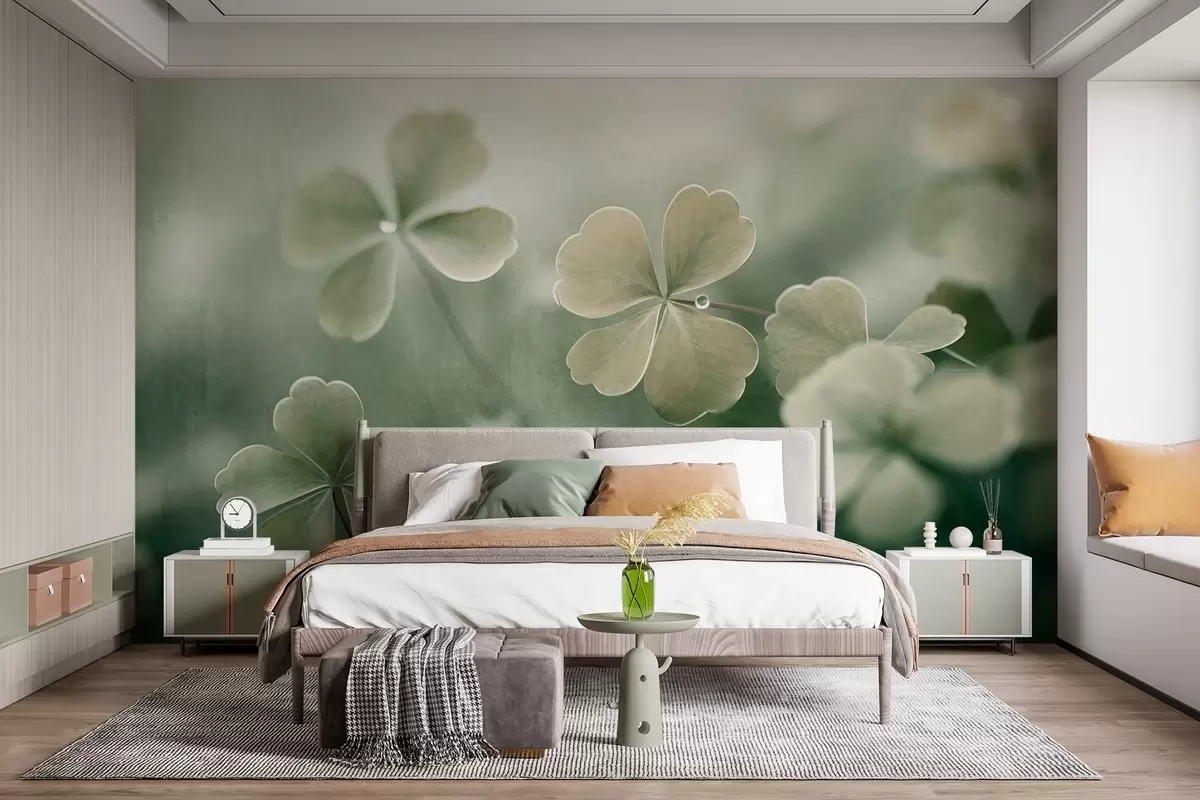 Fototapety Štvorlístok s kvapkami vody, svetlozelená farba, mäkké zaostrenie, rozmazané pozadie, textúrovaná tlač Nr. w09376