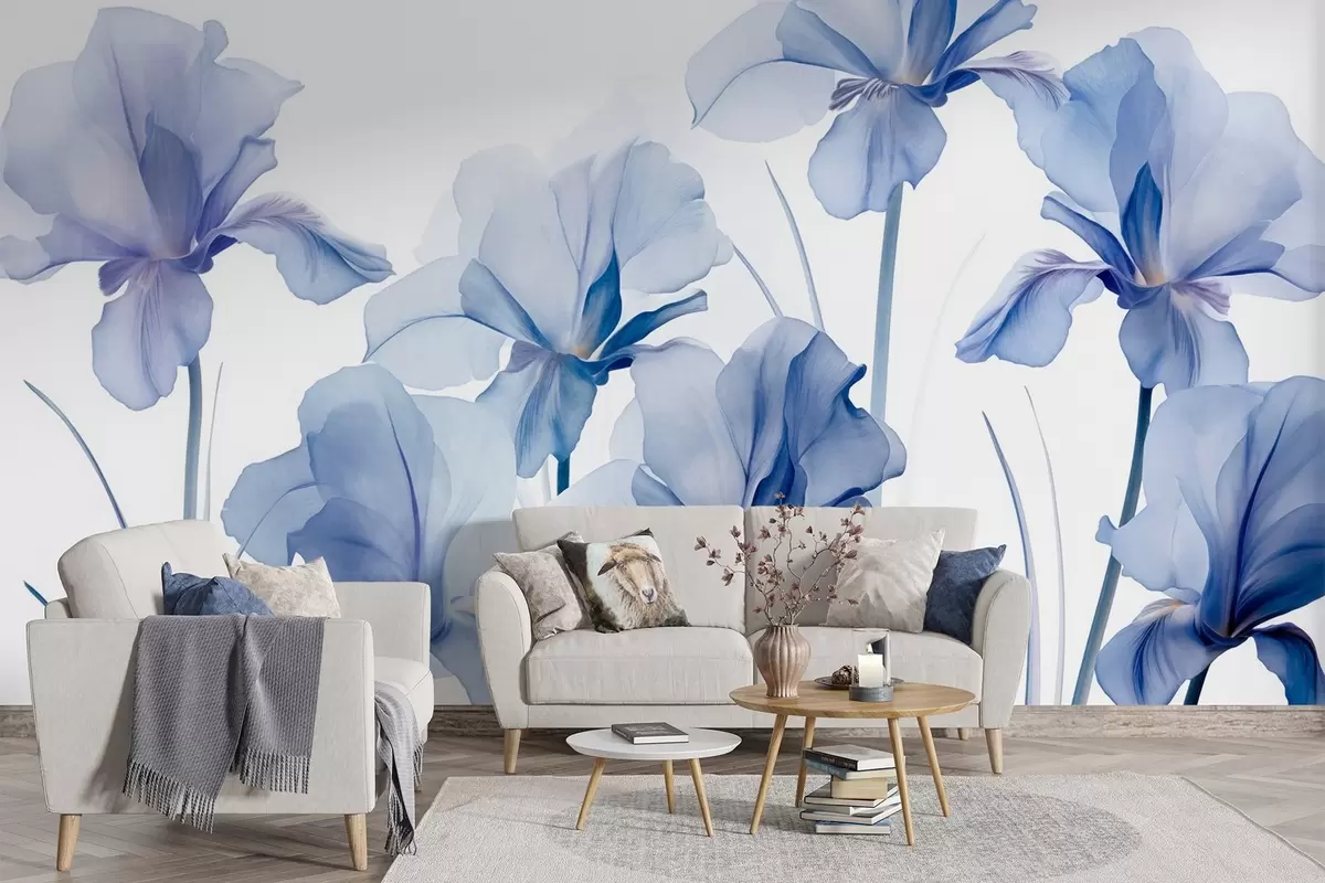 Fototapety Modré kvety kosatca s priesvitnými okvetnými lístkami a dlhými stonkami, usporiadané v rade na modrom pozadí, jemné a štruktúrované Nr. w09379