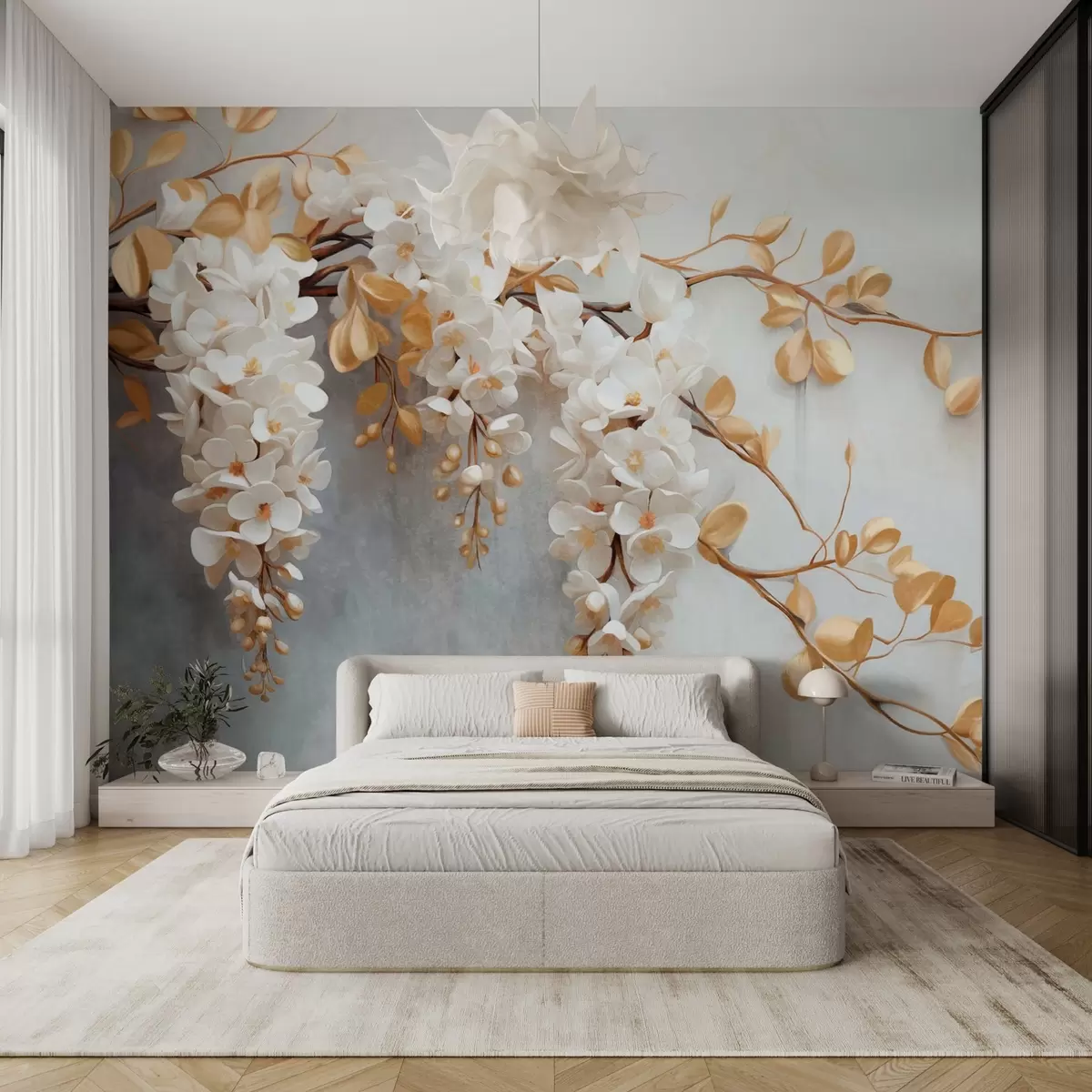 Fototapety Biele kvety vistárie so žltými listami na vetve, kaskádovito sa rozkladajúce na textúrovanom bielom pozadí, jemné okvetné lístky Nr. w09381
