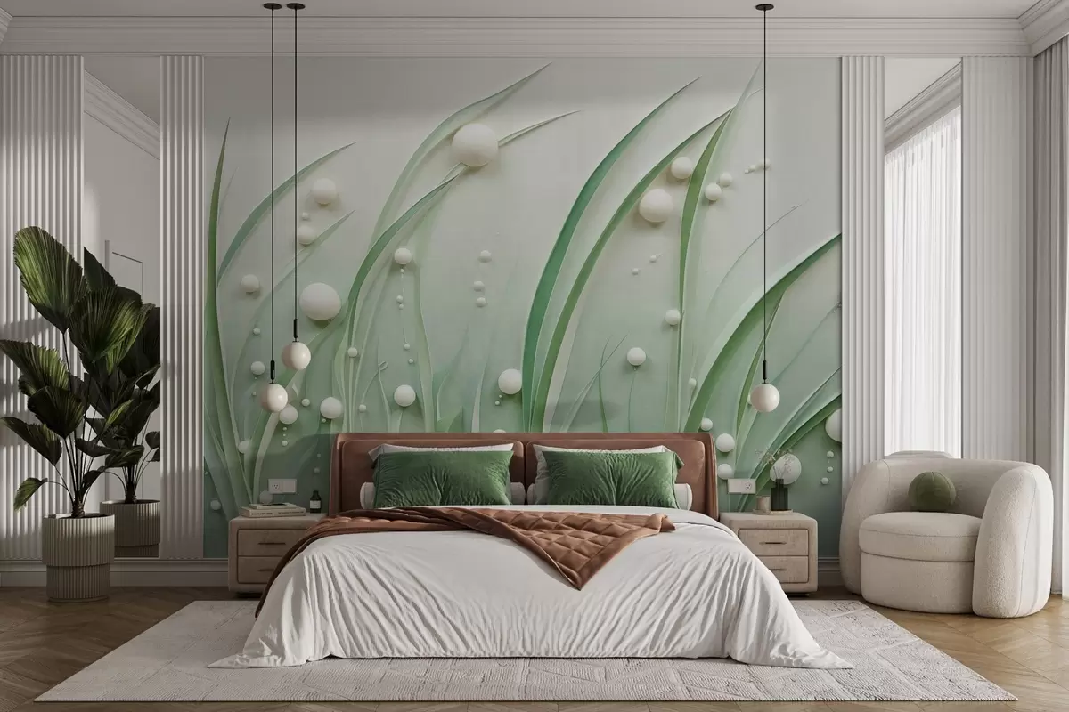 Fototapety Abstraktná zelená tráva s bielymi guľami, svetlozelené pozadie, textúra, čisté línie, minimalistický štýl Nr. w09382