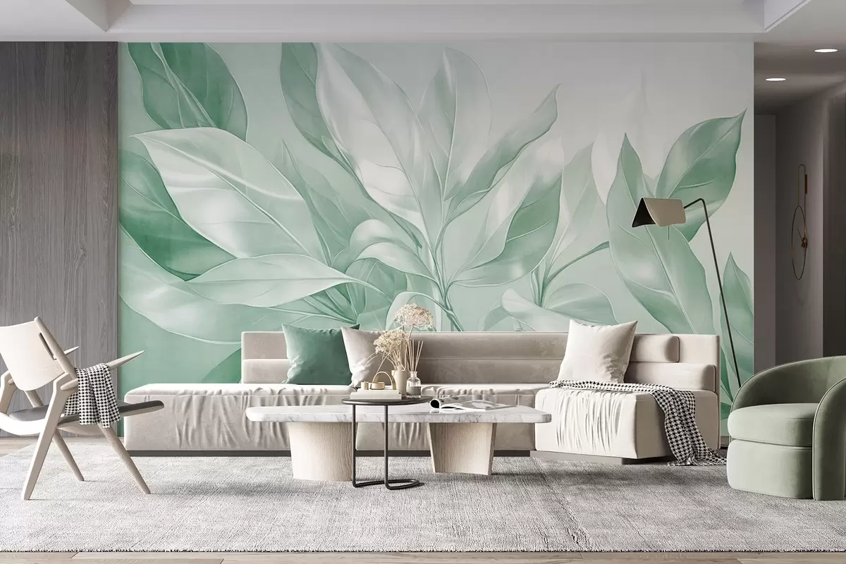 Fototapety Listy magnólie s bielymi a zelenými tónmi, mäkké osvetlenie, elegantná kompozícia, detailné žilky listov, umelecké ťahy štetcom Nr. w09385v1
