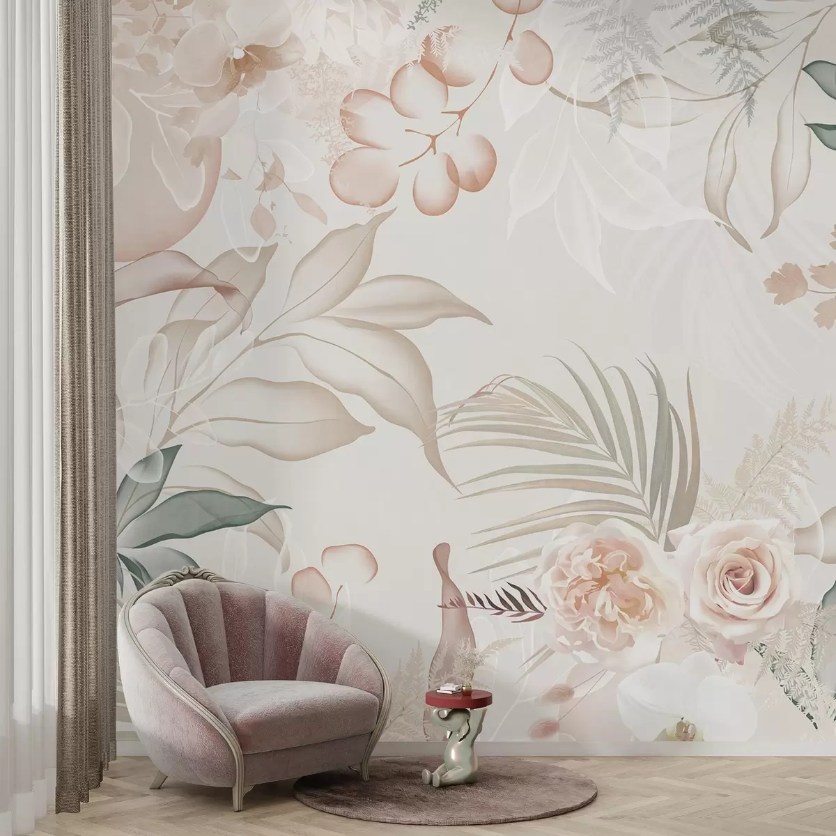 Fototapety Kvetinová kompozícia s ružami, orchideami, eukalyptom a palmovými listami v pastelových farbách, béžové pozadie Nr. w09393
