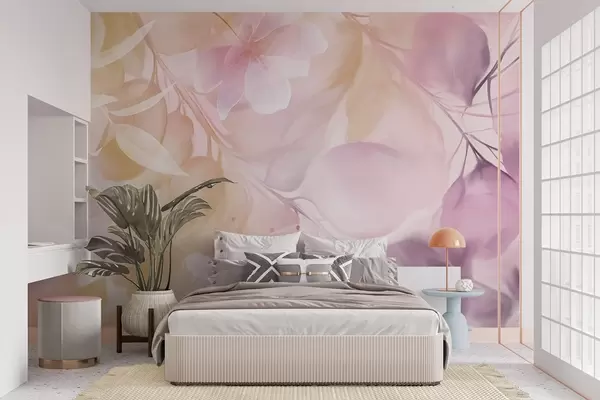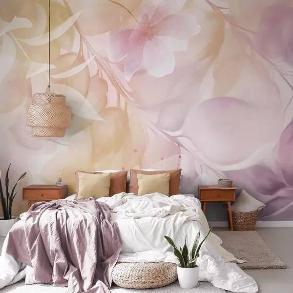 Fototapety Kvetinové umenie s tlmenými žltými a fialovými kvetmi, listami a vetvičkami, jemnými pastelovými farbami a efektom akvarelovej textúry Nr. w09397v2