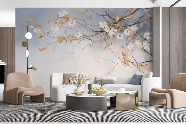 Fototapety Biele kvety s oranžovými listami na vetve stromu, svetlo modré textúrované pozadie, jemné ťahy štetcom Nr. w09415