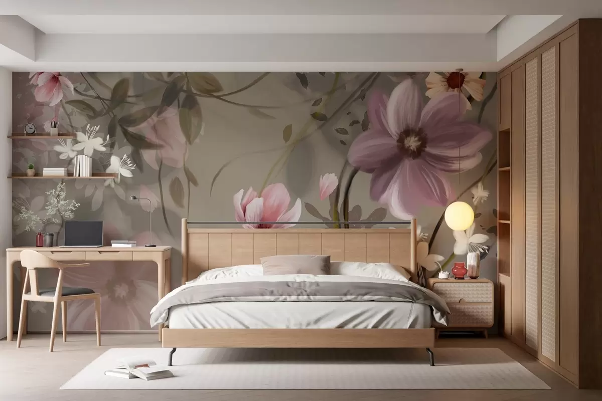 Fototapety Ružové a biele kvety s hnedými stonkami a listami, mäkké osvetlenie, tlmené farby, kvetinová výzdoba Nr. w09417
