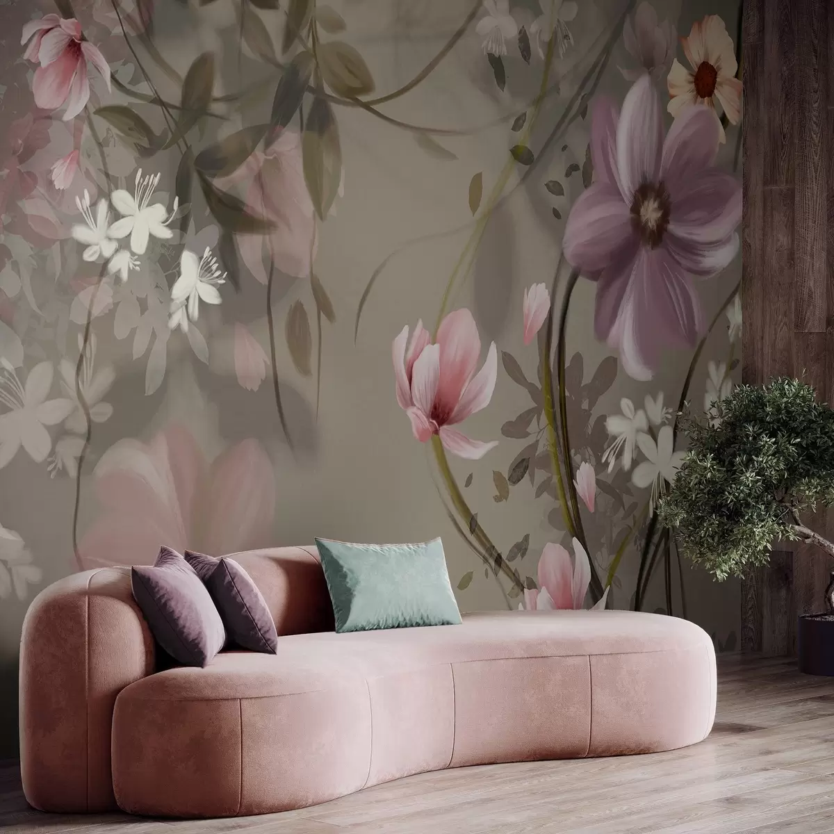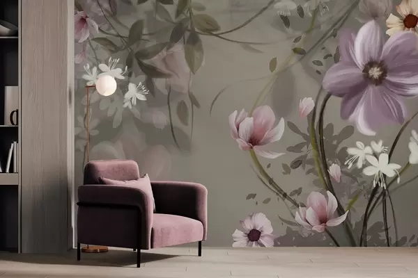 Fototapety Ružové a biele kvety s hnedými stonkami a listami, mäkké osvetlenie, tlmené farby, kvetinová výzdoba Nr. w09417