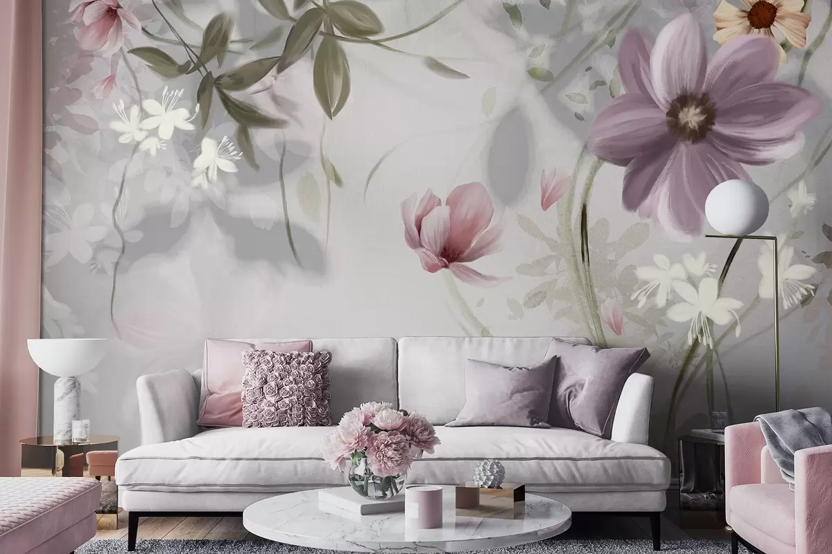 Fototapety Ružové a biele kvety so zelenými stonkami a listami, mäkké osvetlenie, tlmené farby, kvetinová výzdoba Nr. w09417v1