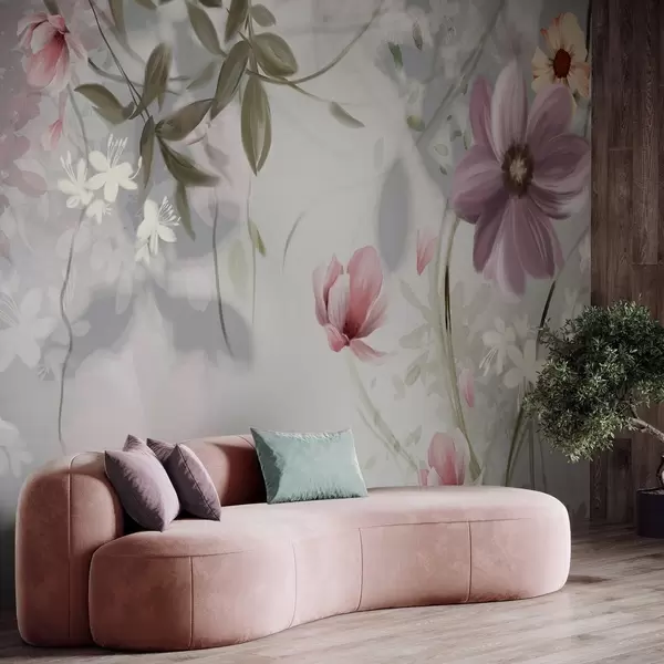 Fototapety Ružové a biele kvety so zelenými stonkami a listami, mäkké osvetlenie, tlmené farby, kvetinová výzdoba Nr. w09417v1