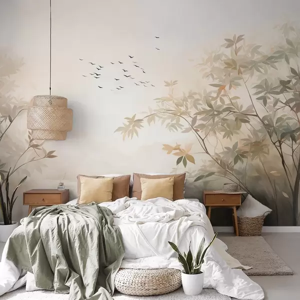 Fototapety Textúrovaná krajina so stromami a kŕdľom vtákov lietajúcich na oblohe, pastelové farby, prírodná scéna Nr. w09418