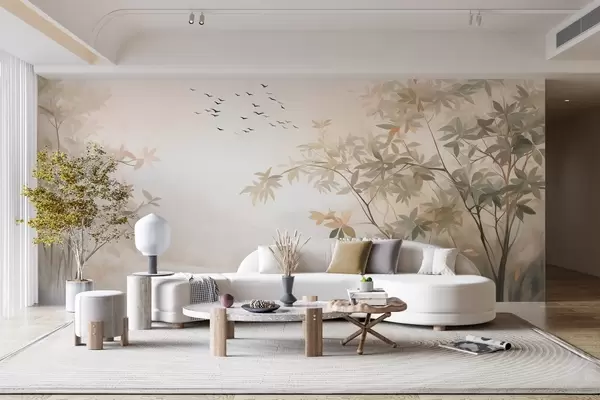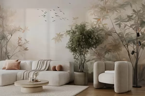 Fototapety Textúrovaná krajina so stromami a kŕdľom vtákov lietajúcich na oblohe, pastelové farby, prírodná scéna Nr. w09418