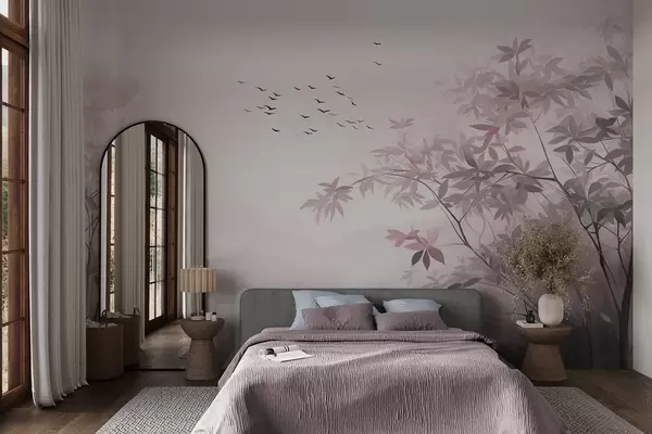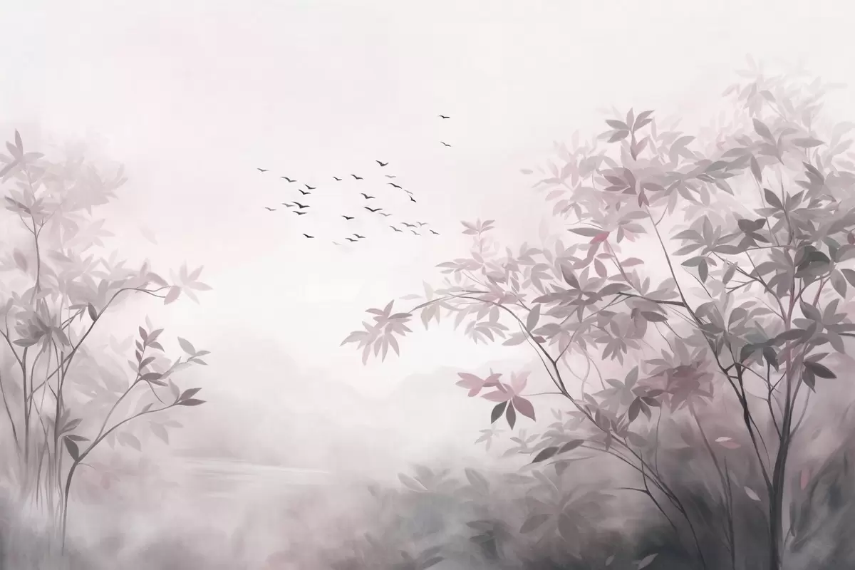 Fototapety Textúrovaná krajina so stromami a kŕdľom vtákov lietajúcich na oblohe, pastelové farby, prírodná scéna Nr. w09418v1