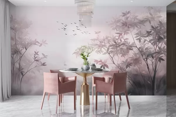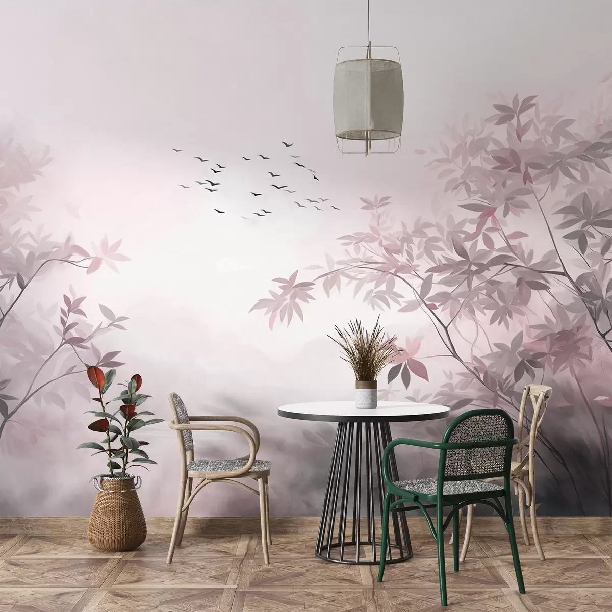 Fototapety Textúrovaná krajina so stromami a kŕdľom vtákov lietajúcich na oblohe, pastelové farby, prírodná scéna Nr. w09418v1