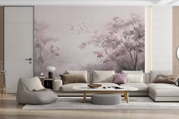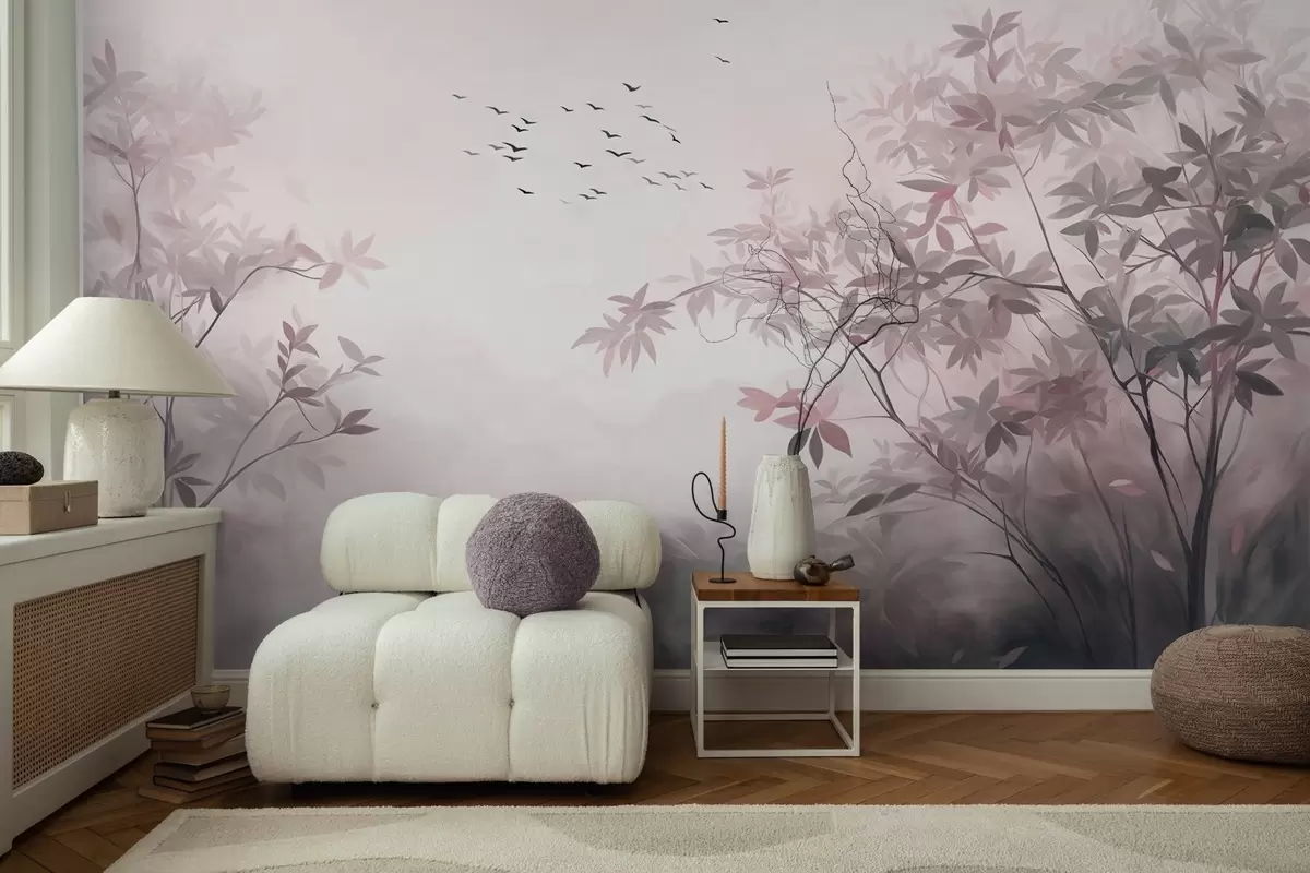 Fototapety Textúrovaná krajina so stromami a kŕdľom vtákov lietajúcich na oblohe, pastelové farby, prírodná scéna Nr. w09418v1