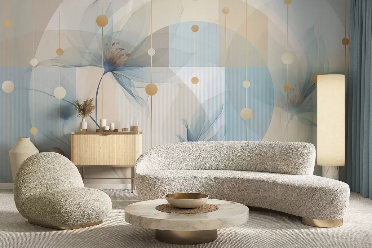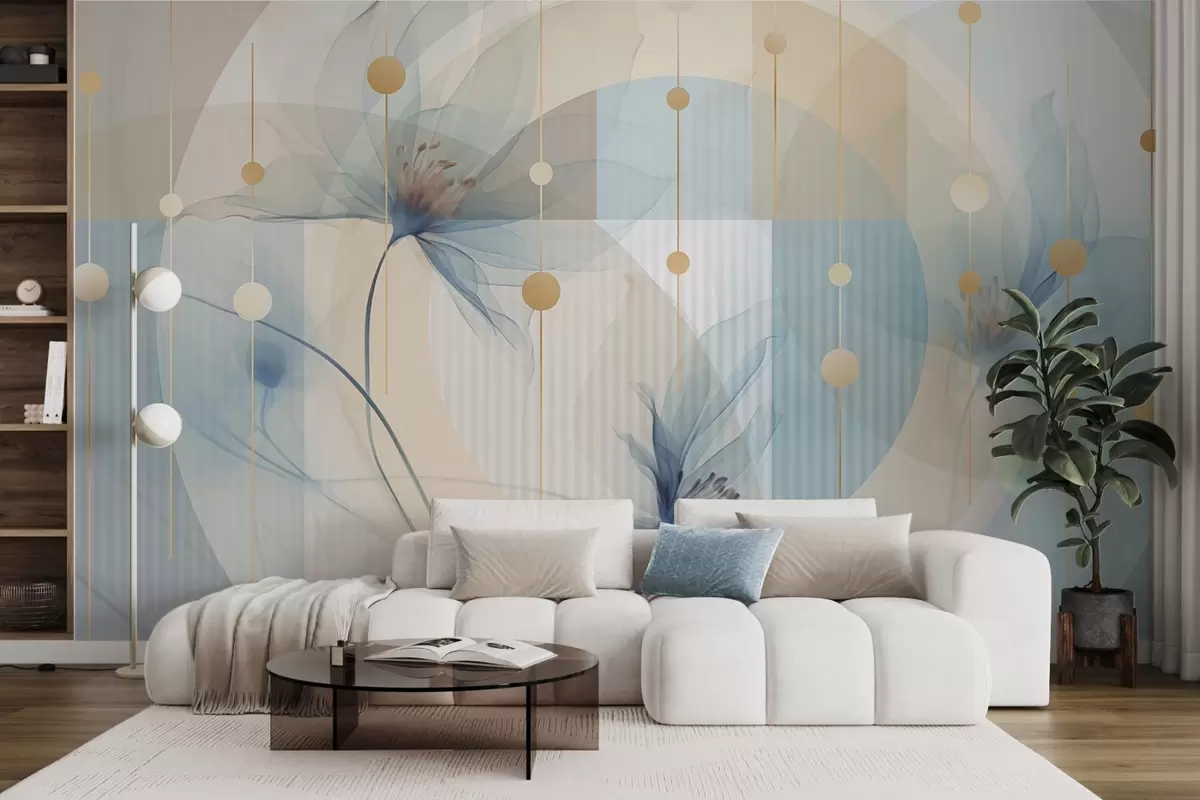 Fototapety Abstraktné priehľadné kvety, kruhy a geometrické tvary, pastelovo modrá, béžová a biela farebná paleta Nr. w09419