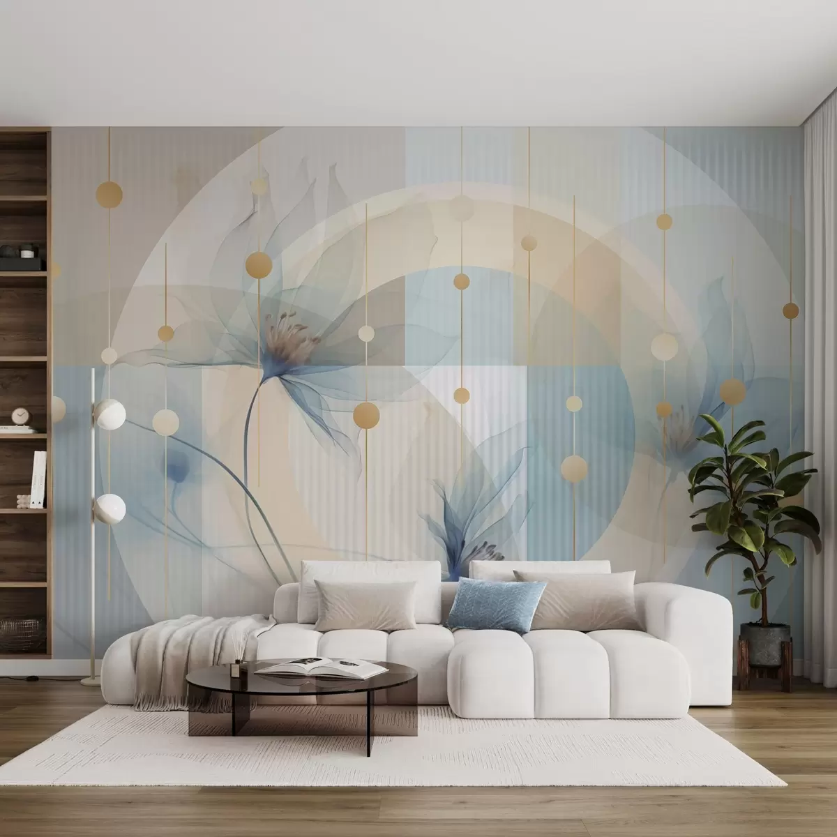 Fototapety Abstraktné priehľadné kvety, kruhy a geometrické tvary, pastelovo modrá, béžová a biela farebná paleta Nr. w09419