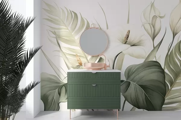 Fototapety Biele kala a zelené tropické listy, botanická ilustrácia, svetlé pozadie, vintage štýl, textúrované Nr. w09423