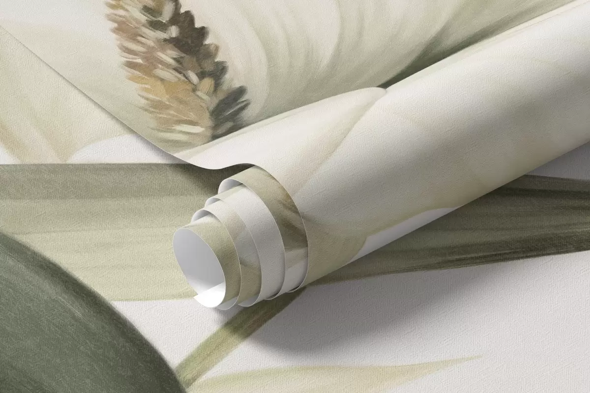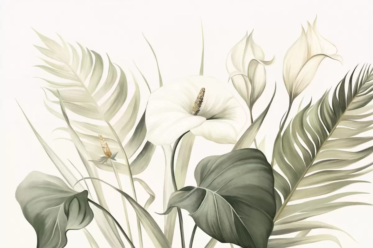Fototapety Biele kala a zelené tropické listy, botanická ilustrácia, svetlé pozadie, vintage štýl, textúrované Nr. w09423