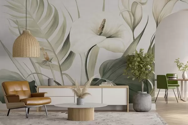 Fototapety Biele kala a zelené tropické listy, botanická ilustrácia, svetlé pozadie, vintage štýl, textúrované Nr. w09423