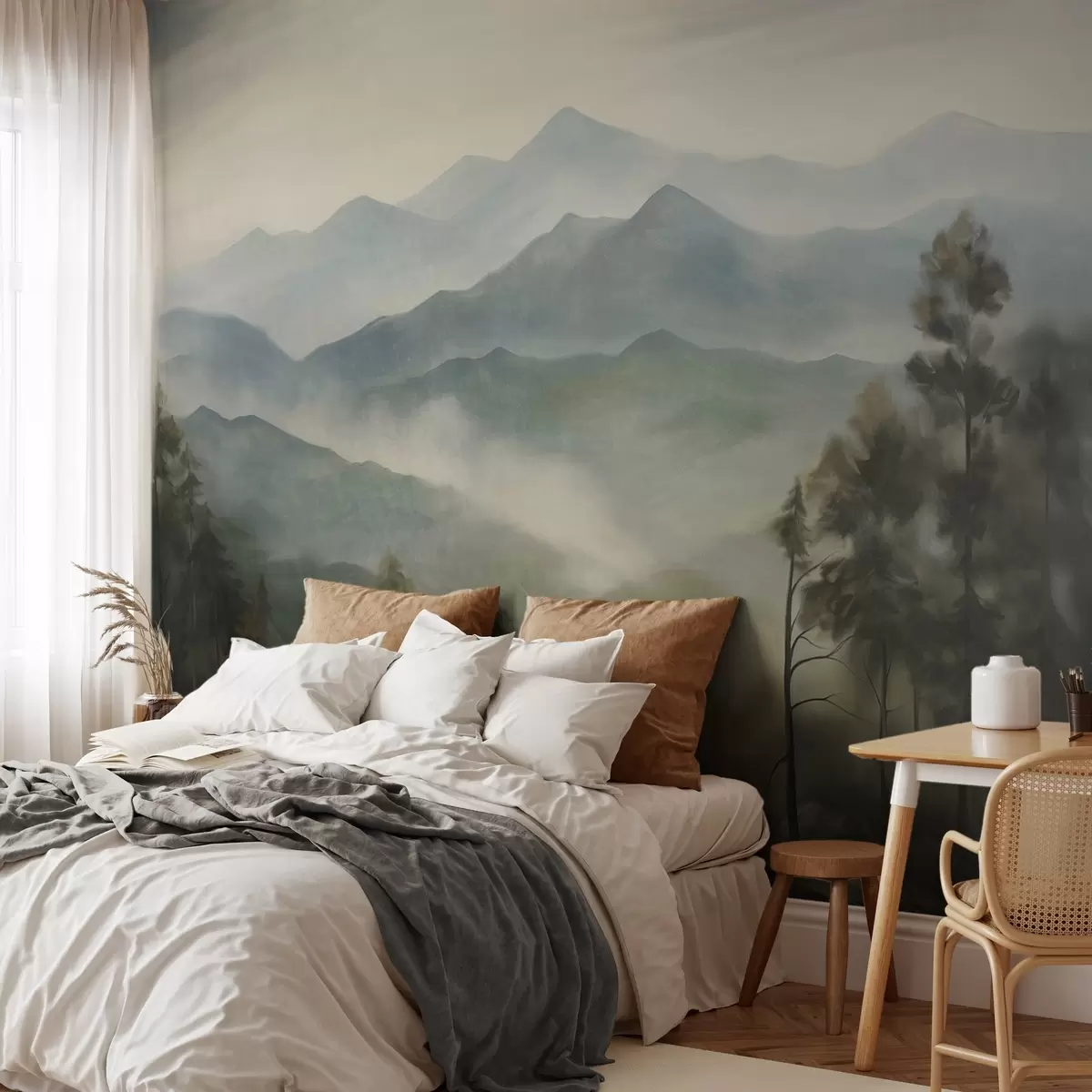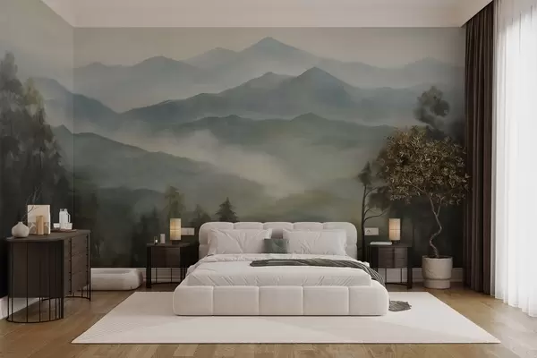 Fototapety Hmlisté pohorie so stromami, hmla, zamračená obloha, tlmené farby, štýl krajinomaľby Nr. w09424
