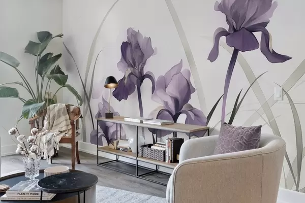 Fototapety Fialové kvety kosatca so zelenými stonkami, štýl akvarelovej maľby, biele pozadie, jemné farby, elegantné, umelecké Nr. w09425