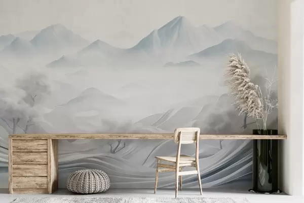 Fototapety Snehová abstraktná dekoratívna horská krajina s bielymi stromami a hmlou, minimalistický štýl s textúrou Nr. w09426