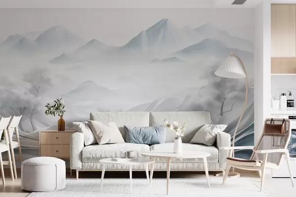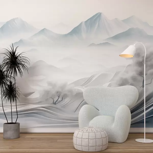 Fototapety Snehová abstraktná dekoratívna horská krajina s bielymi stromami a hmlou, minimalistický štýl s textúrou Nr. w09426