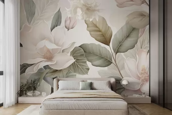 Fototapety Kvety magnólie s listami v pastelových farbách, bielej, ružovej a zelenej, jemné, delikátne, v akvarelovom štýle Nr. w09427