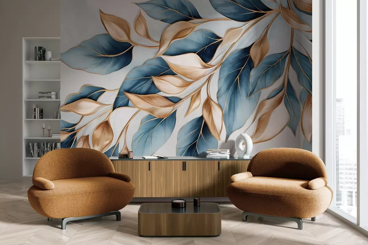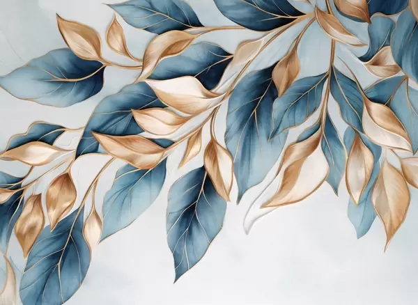 Fototapety Textúrované modré a oranžové listy, svetlo modré pozadie, elegantný a umelecký dizajn, moderný štýl Nr. w09429