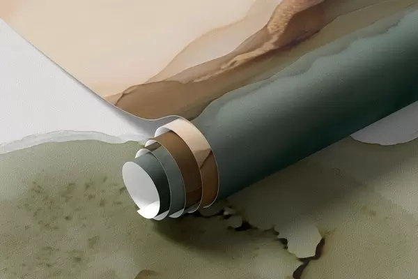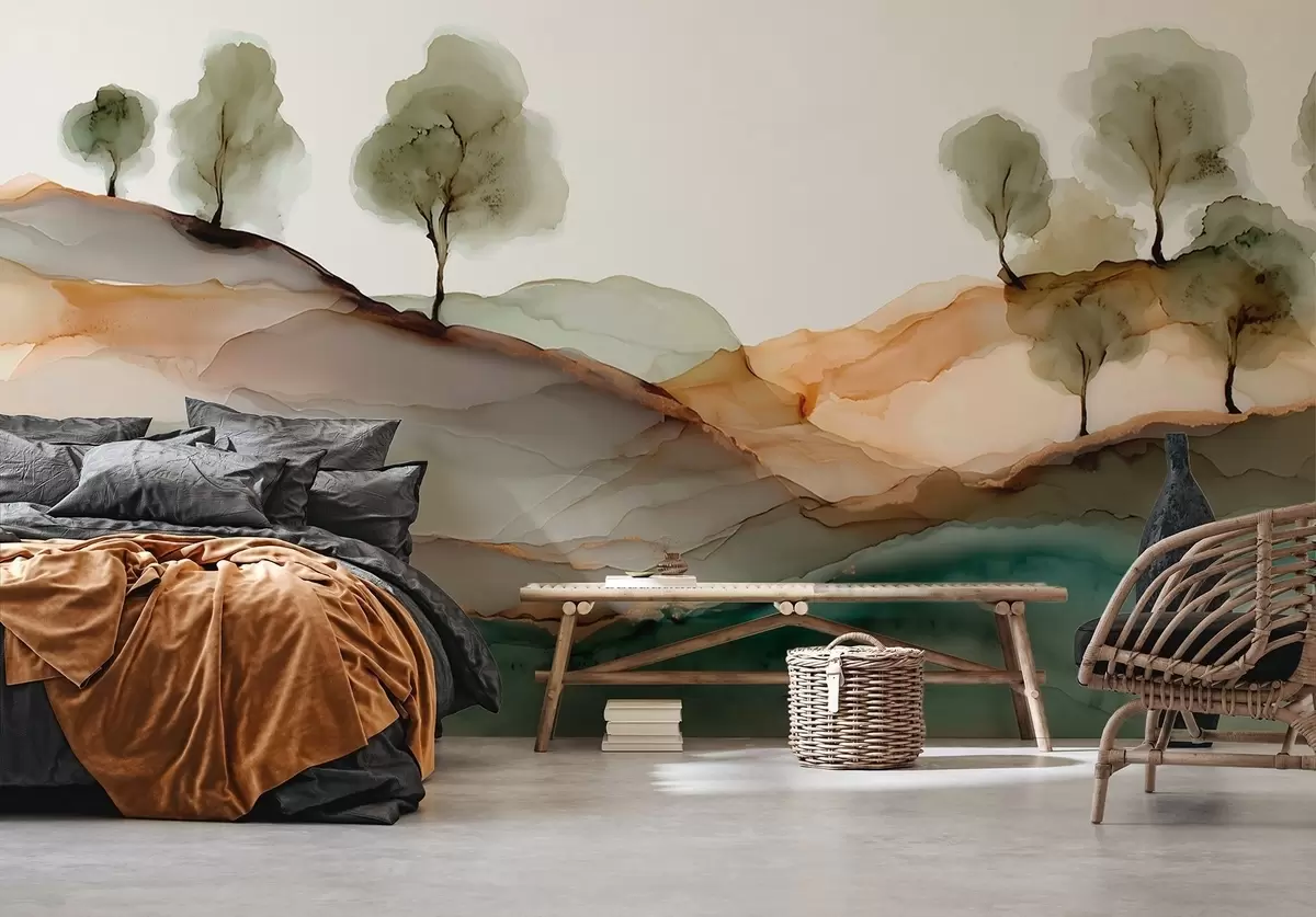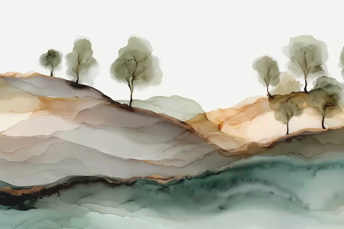 Fototapety Abstraktná krajina v štýle alkoholových farieb — kopce a stromy v pastelových odtieňoch Nr. w09457